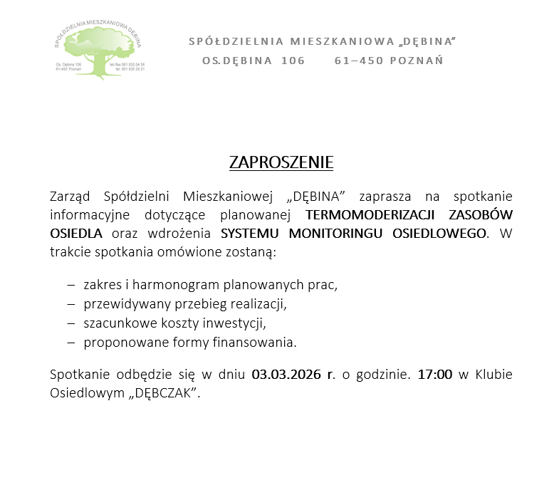 Zarząd Spółdzielni Mieszkaniowej „DĘBINA” zaprasza na spotkanie informacyjne dotyczące planowanej TERMOMODERIZACJI ZASOBÓW OSIEDLA oraz wdrożenia SYSTEMU MONITORINGU OSIEDLOWEGO. W trakcie spotkania omówione zostaną: